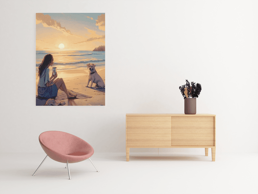 Sunset Girl On A Beach, Labrador & Girl On Sunset Beach, Premium, Satin Canvas, Stretched.